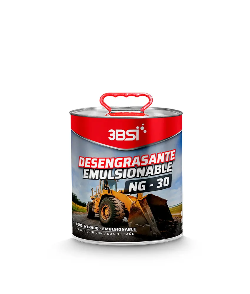 El Desengrasante Emulsionable NG-30 de 3BSI Compuesto por detergentes e hidrocarburos alifáticos, que se EMULSIONAN cuando se mezclan con agua formando una solución líquida detergente muy activa. Se aplica en los talleres de mecánica y la industria en general para el desengrase y limpieza de piezas, maquinarias, motores, pisos de taller y en las áreas de mantenimiento; como reemplazo de combustibles y otros solventes que son dañinos para la salud. Ideal para aplicar en tinas de lavado por inmersión y pulverizar.